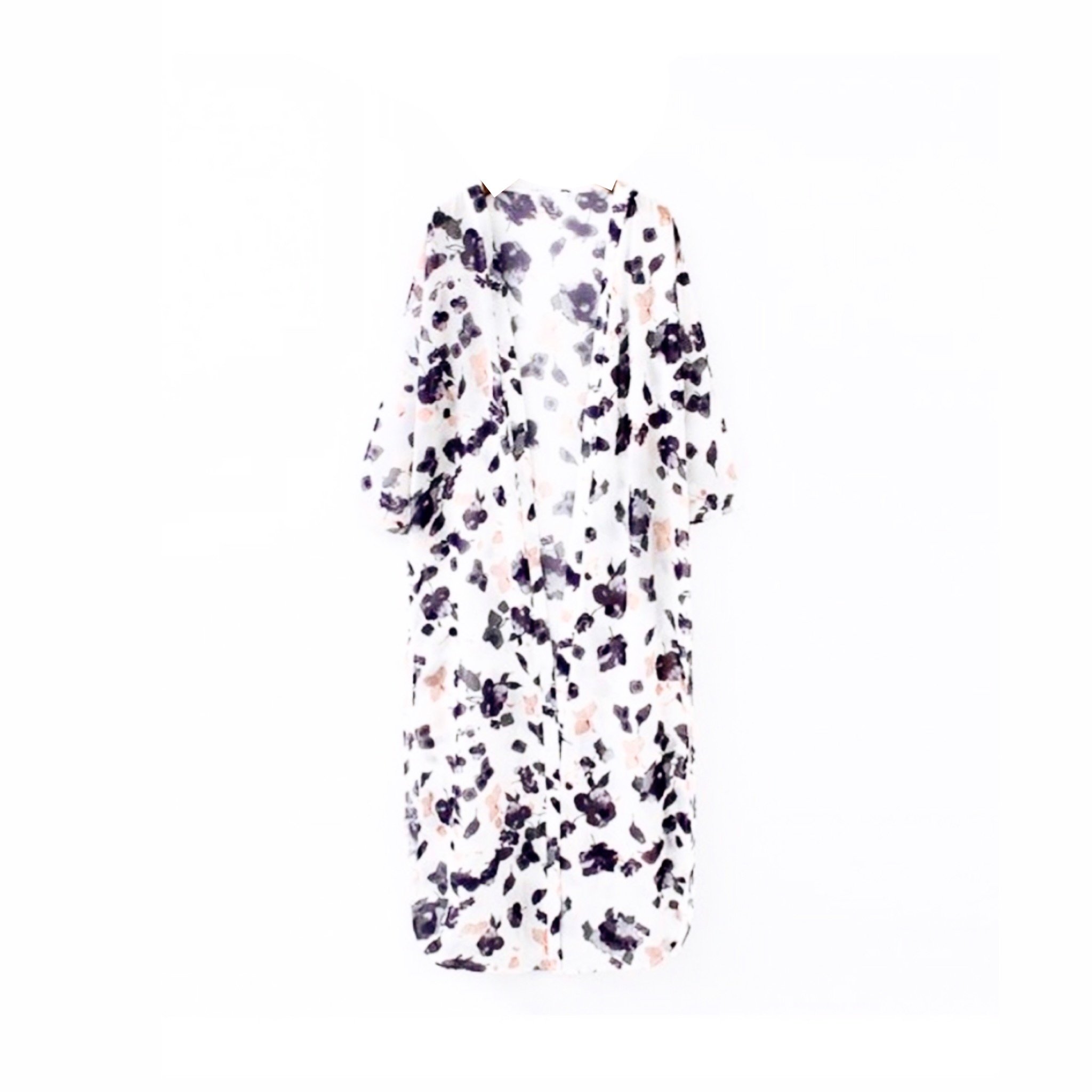 Boho beautiful flowy kimono top with floral colors blues , white, cream and blush all beautiful light colors . A perfect summer accent to accent to any outfit.
