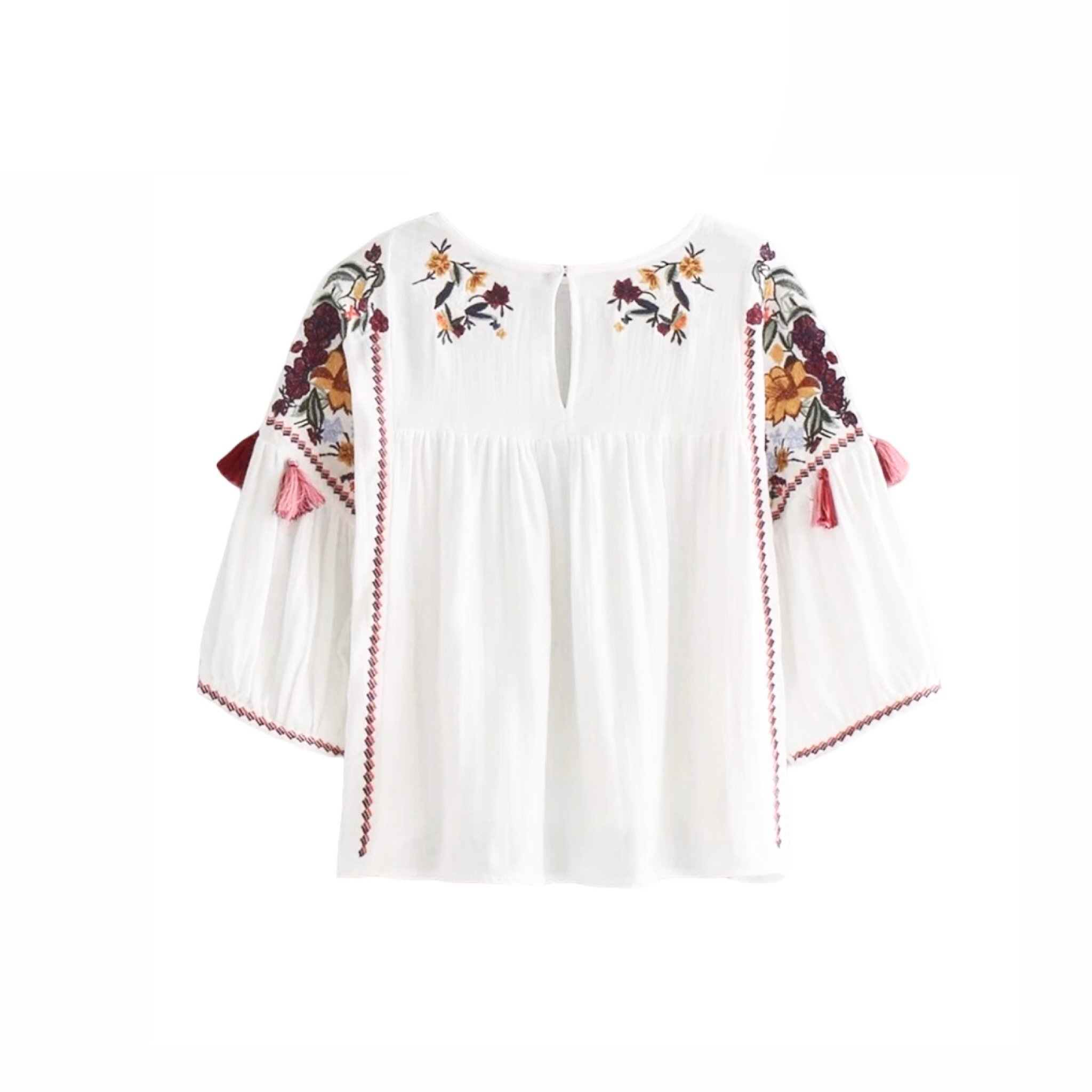 Baby doll style top. This top has beautiful pinks, oranges and tons of florals across the blouse with cute little tassels.